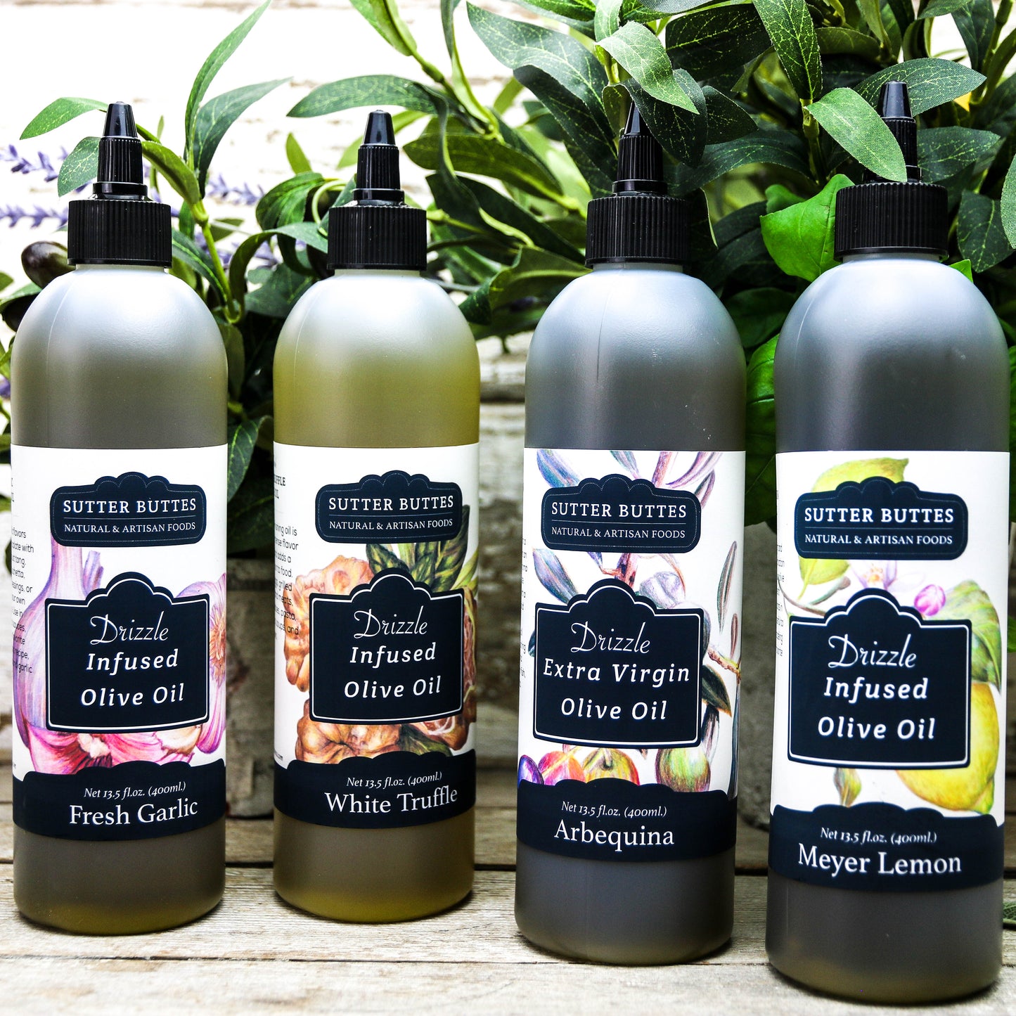 New offering from Sutter Buttes! Our best sellers in 400ml Drizzle bottles so handy for all your Olive Oil Needs. Available in Our award winning Arbequina Extra Virgin Olive Oil, Fresh Harvest Garlic, Meyer Lemon and Earthy White Truffle.