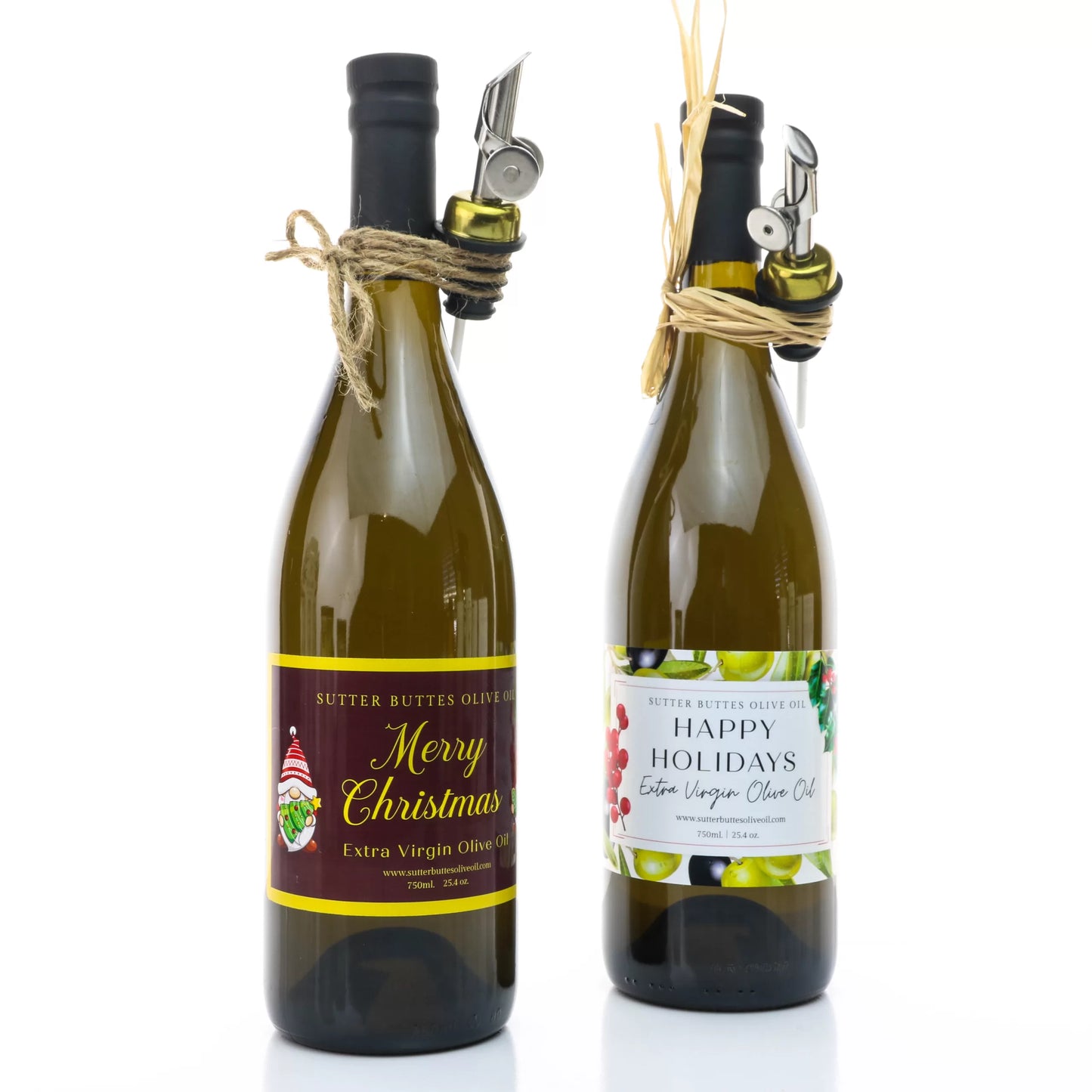 Our premium 750ml Extra Virgin Olive Oil comes with your choice of “Merry Christmas” or “Happy Holidays” label. Mild, versatile, and beautifully bottled, it’s ideal for gifting or elevating festive meals. Add a pour spout for extra flair.