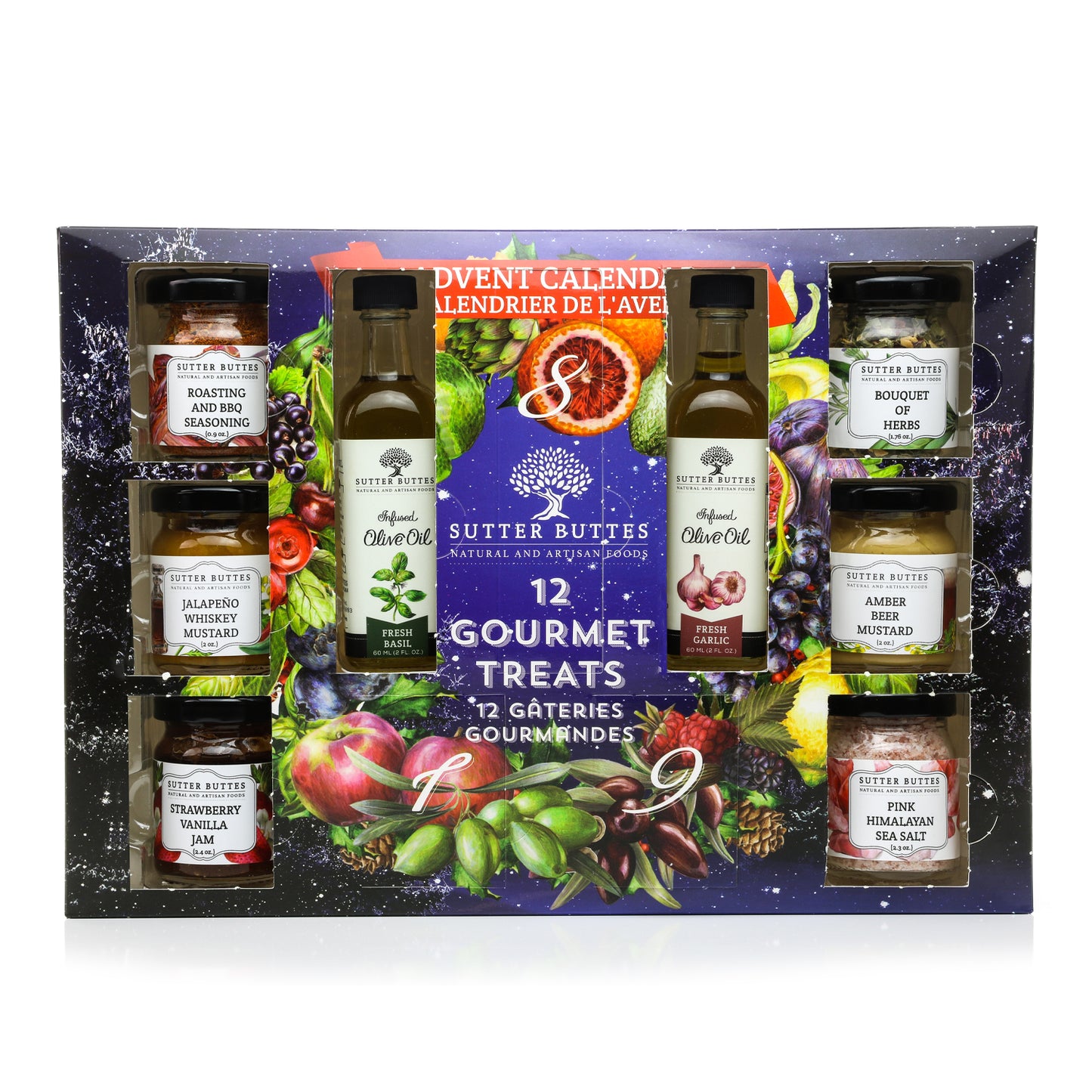 Countdown to the holidays with 11 gourmet items including Cranberry Balsamic, Fresh Basil & Garlic Olive Oils, Strawberry Vanilla Jam, Mustards, Tapenade, and a recipe booklet.